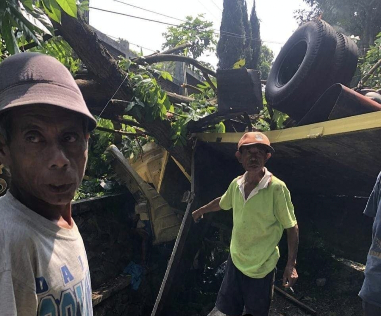 “Pecah ban dari sini, mau ngehantem tiang listrik, ngehantem mobil, isinya tiga orang, truknya dari atas, mungkin rem blong soalnya kecepatan tinggi, nyerempet itu mobil,” jelas Cucu.