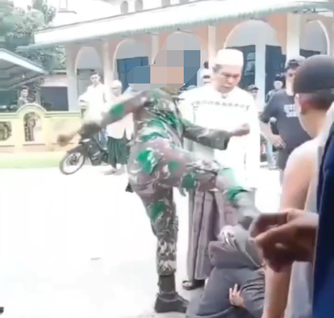 DELI SERDANG- Seorang TNI tendang warga, di pinggir jalan Dusun 1, Desa Jaharun B, Kampung Johar Baru, Kecamatan Galang, Deli Serdang, Sumatera Utara.