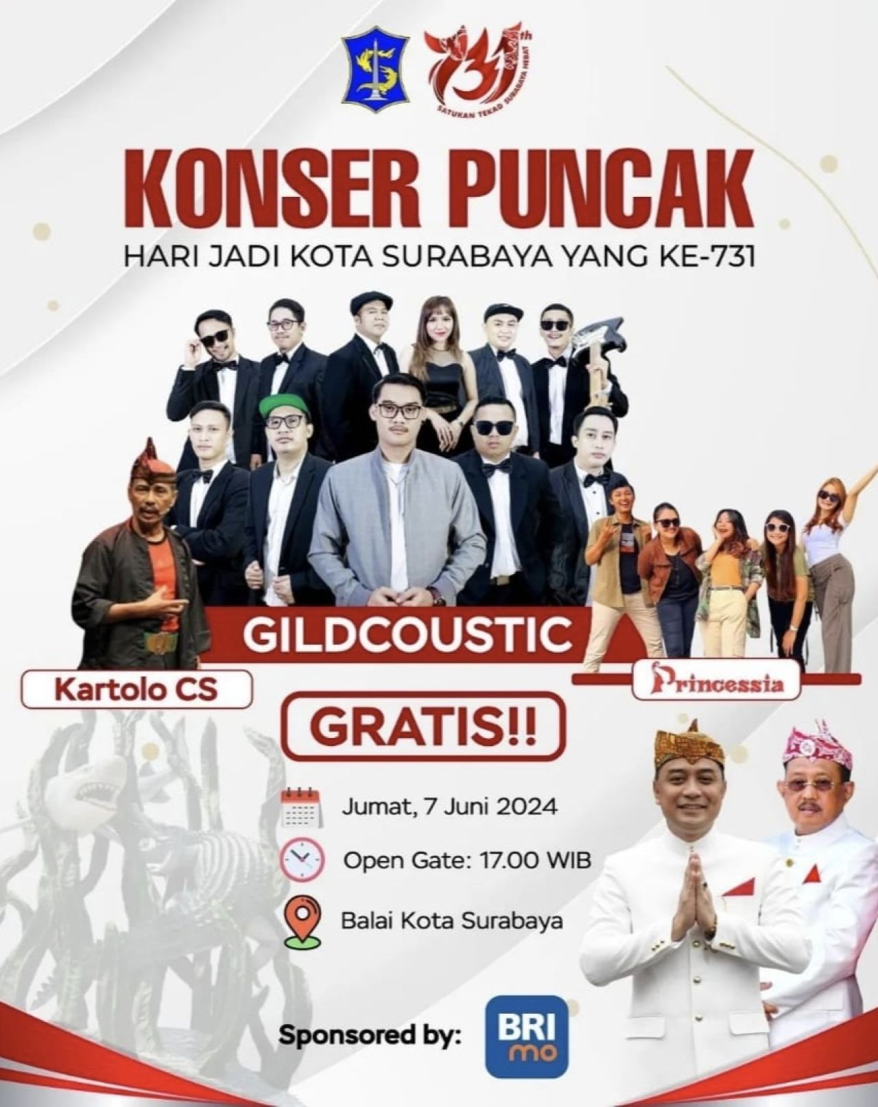 "Jadi ayo warga Surabaya hadiri konser Puncak HJKS ke-731 dan nikmati kemeriahannya. Rencananya, Gildcoustic akan menampilkan kurang lebih 9 lagu, termasuk lagu hits mereka," ujarnya.