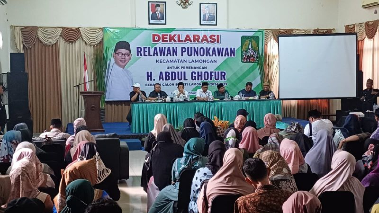 LAMONGAN (Realita) - Ratusan relawan yang tergabung dalam "Puno Kawan" berkumpul mendeklarasikan dukungan kepada Bakal Calon (Bacalon) Bupati Lamongan, Abdul Ghofur. Jum'at (07/05/2024).
