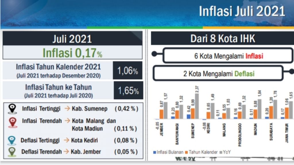 SURABAYA (Realita) - Provinsi Jawa Timur pada Juli 2021 kemarin mengalami inflasi sebesar 0,17 persen. Dari 8 kota IHK di Jawa Timur, 6 kota mengalami inflasi dan 2 kota lainnya deflasi.