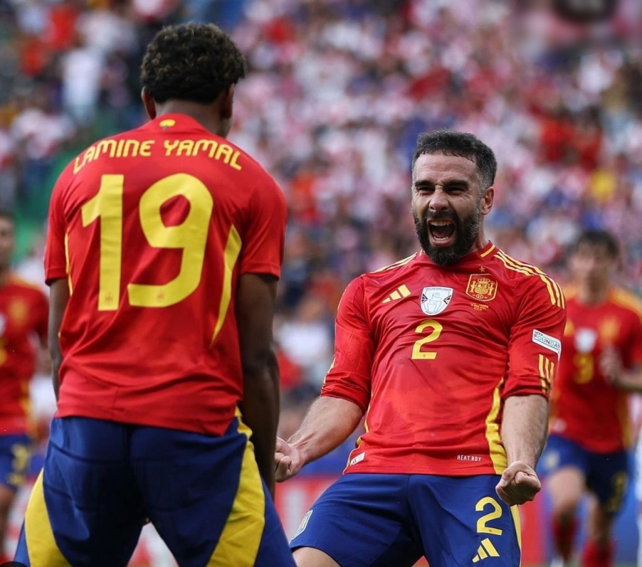 Di masa injury time, Spanyol sukses memperlebar keunggulan mereka menjadi 3-0. Berawal dari umpan silang Lamine Yamal, Carvajal yang berada di kotak penalti berhasil menyambar umpan itu dengan kakinya dan menjadi gol. Skor 3-0 menutup jalannya babak pertama.