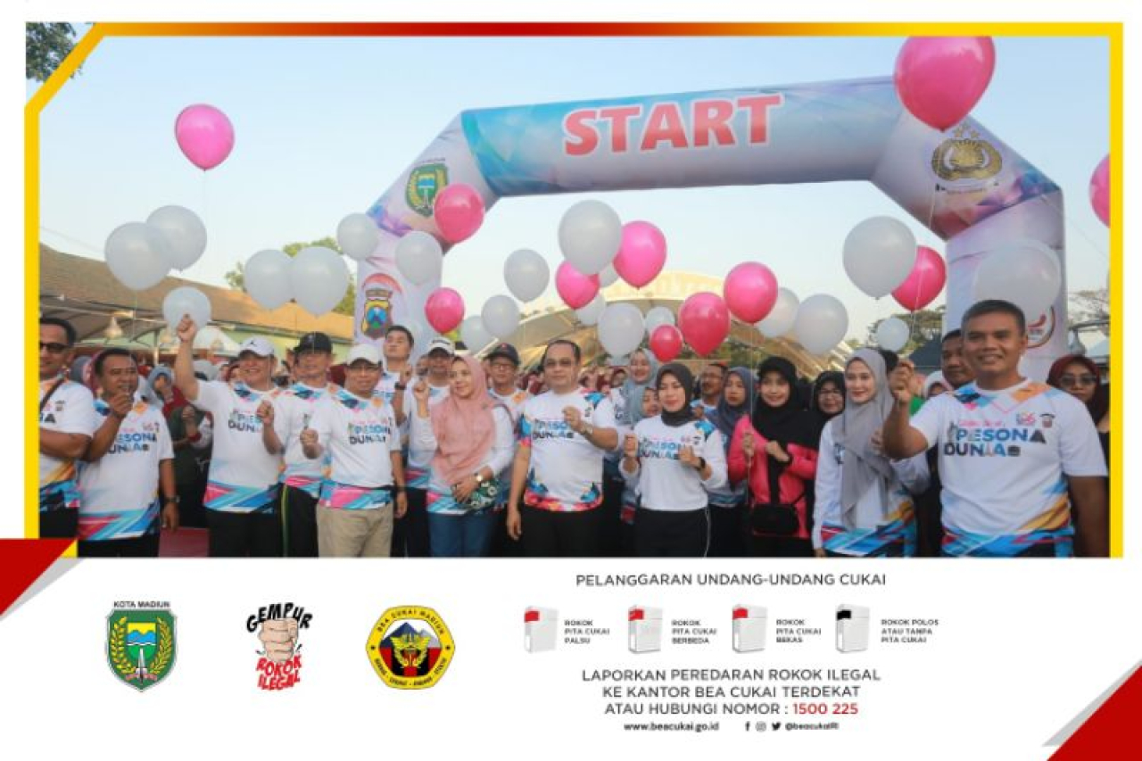 Sementara, Kepala Satpol PP dan Damkar Kota Madiun, Sunardi Nurcahyono mengatakan, event Jalan Sehat Bareng Pj Wali Kota Madiun sengaja digelar di tengah-tengah kemeriahan HJM ke-106. Selain memeriahkan HJM, event juga memiliki misi dalam sosialisasi perundangan tentang cukai. Pun, peserta dibekali pemahaman tentang rokok ilegal oleh petugas KPPBC Madiun sekaligus dampak serta bahaya bagi negara dan masyarakat.