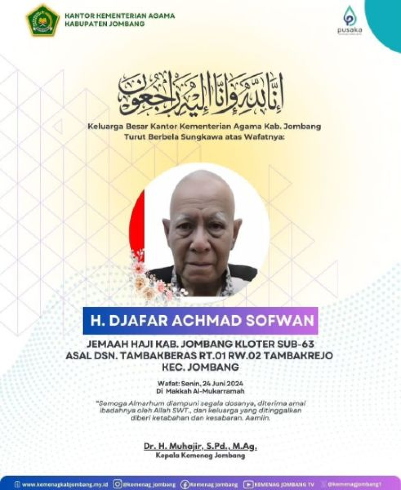 Jemaah kedua yang meninggal dunia adalah Djafar Achmad Sofyan (77), warga Dusun/Desa Tambakrejo, Kecamatan/Kabupaten Jombang. Djafar sempat dirujuk ke ICU di RS Makkah sebelum dinyatakan meninggal dunia pada Senin (24/06/2024) pukul 16.20 WIB.