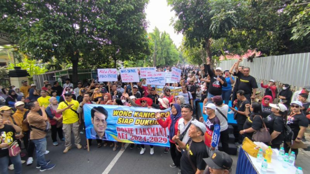 MADIUN (Realita) – Ribuan orang mendatangi kediaman Bonie Laksmana di Jalan Salak 78, Kelurahan/Kecamatan Taman, Kota Madiun, Minggu (30/6/2024). Aksi tersebut merupakan gerakan masyarakat untuk mendesak anak mantan Wali Kota Madiun, Bambang Irianto tersebut maju di Pilkada Kota Madiun.