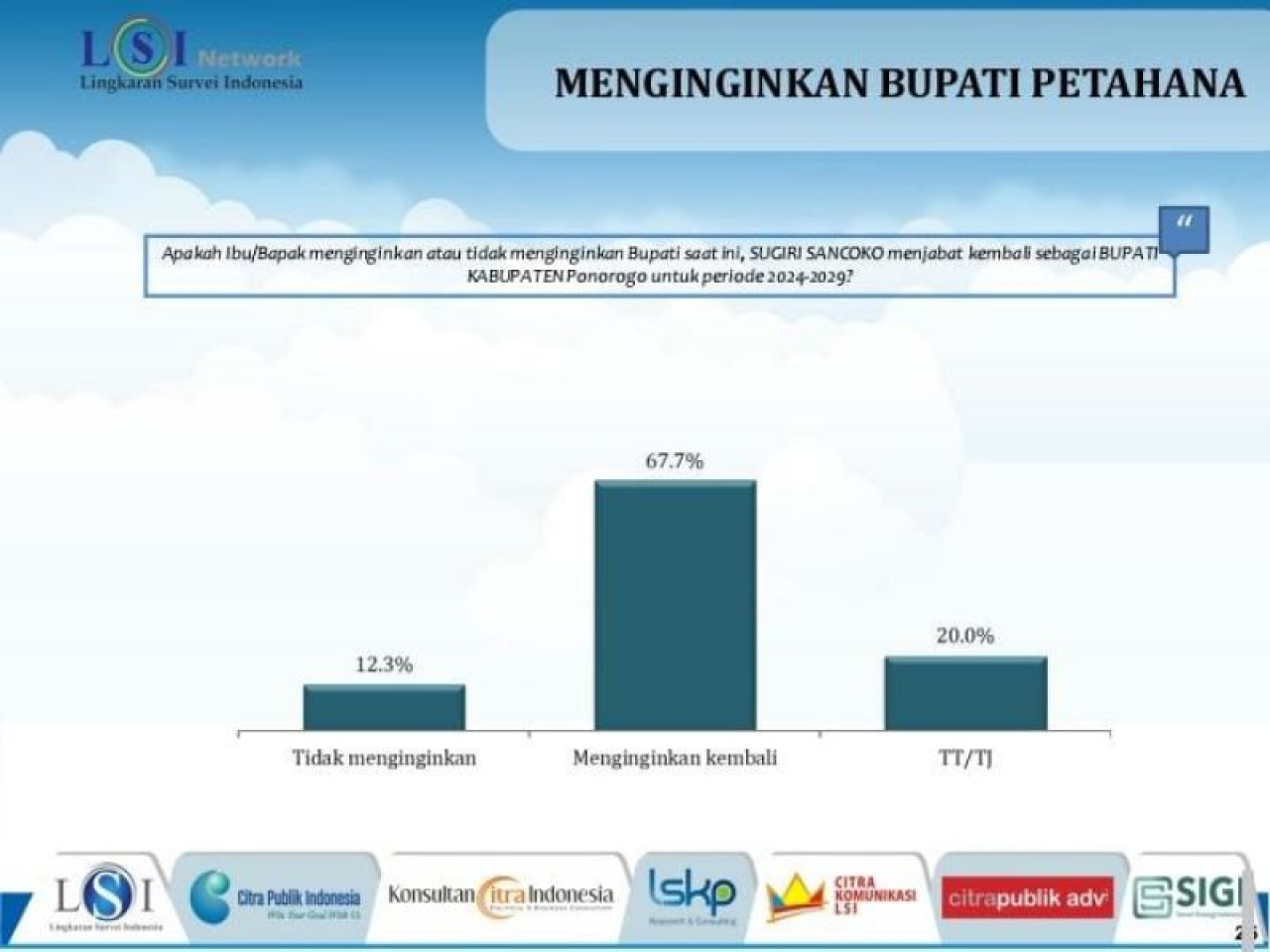 Masih tinggi angka elektabilitas dan popularitas pasangan calon Bupati dan Wakil Bupati Incumbent ini, membuat 67,7 persen warga Ponorogo menginginkan keduanya kembali memimpin Ponorogo. znl