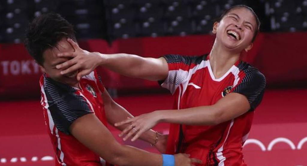 Peraih medali emas badminton ganda putri, Apriyani Rahayu dan Greysia Polii, menjadi atlet terakhir yang tiba dan disambut dengan karangan bunga. Keduanya tak lupa menunjukkan medali kepada para wartawan.