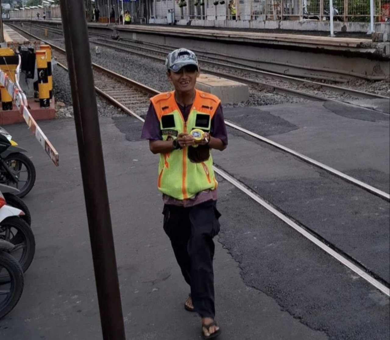 Ia memang sehari-harinya membantu mengatur lalu lintas motor maupun mobil di perlintasan kereta tersebut.