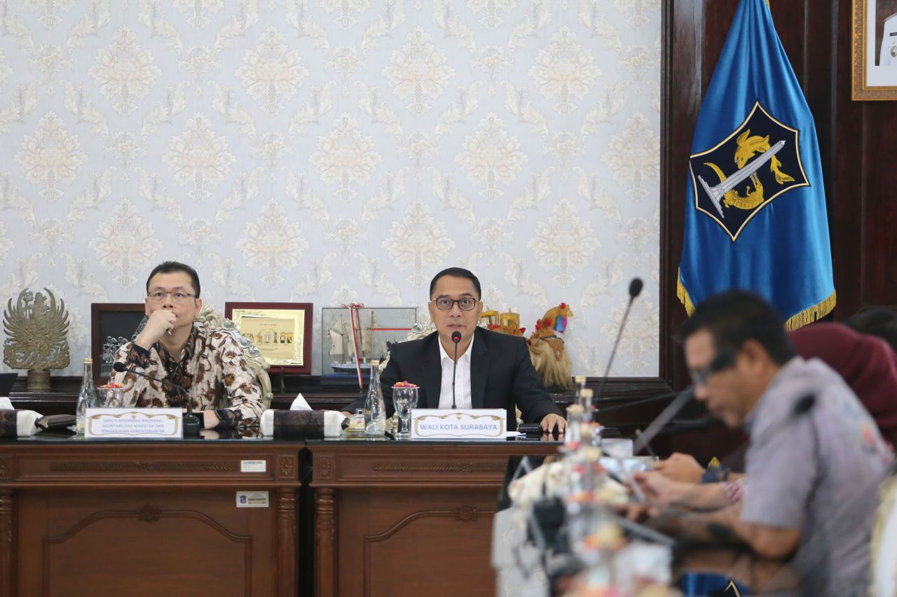 Wali Kota Surabaya Eri Cahyadi menyambut langsung kedatangan rombongan Tim RB Nasional di ruang sidang Wali Kota Balai Kota Surabaya, Kamis (11/7/2024). Hadir pula seluruh Perangkat Daerah (PD) terkait, camat dan lurah di lingkup Pemkot Surabaya.