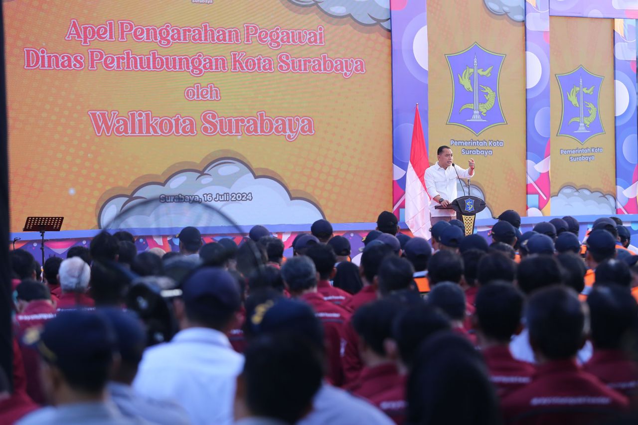 SURABAYA (Realita)- Wali Kota Surabaya Eri Cahyadi menggelar apel pagi bersama jajaran Kepala Perangkat Daerah (PD), Dinas Perhubungan (Dishub), Camat dan Lurah di halaman Balai Kota, Selasa (16/7/2024). Dalam kesempatan tersebut, ia fokus untuk mengevaluasi kinerja Dishub mulai dari penertiban parkir liar dan lalu lintas.