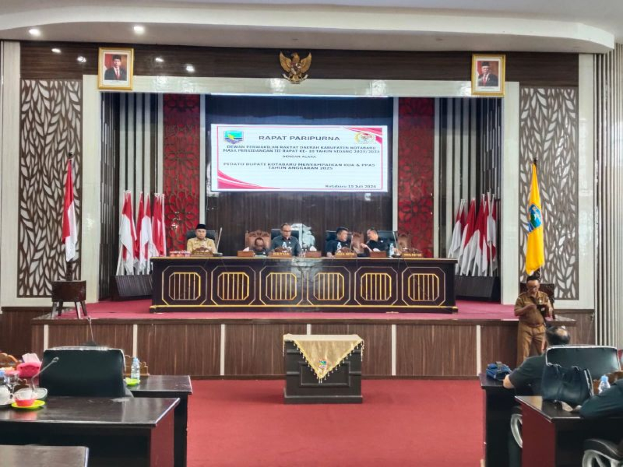 KOTABARU (Realita)- DPRD Kotabaru adakan rapat pleno dengan agenda penyampaian pidato Bupati Kotabaru tentang Kebijakan Umum Anggaran (KUA) dan Prioritas Plafon Anggaran Sementara (PPAS) Tahun Anggaran 2025 yang dipimpin langsung oleh Ketua DPRD Kotabaru Syairi Mukhlis. S. Sos, Senin (15/07/2024).