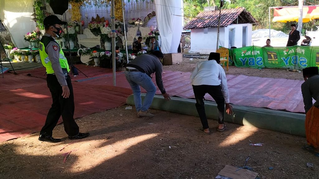 SUMENEP (Realita) - Aparat dari gabungan Polri dan TNI bersama Tim Satgas Covid-19, membubarkan pesta pernikahan di Kecamatan Saronggi dan Bluto, Sumenep, Madura, Jawa Timur, Jumat (6/8/2021).