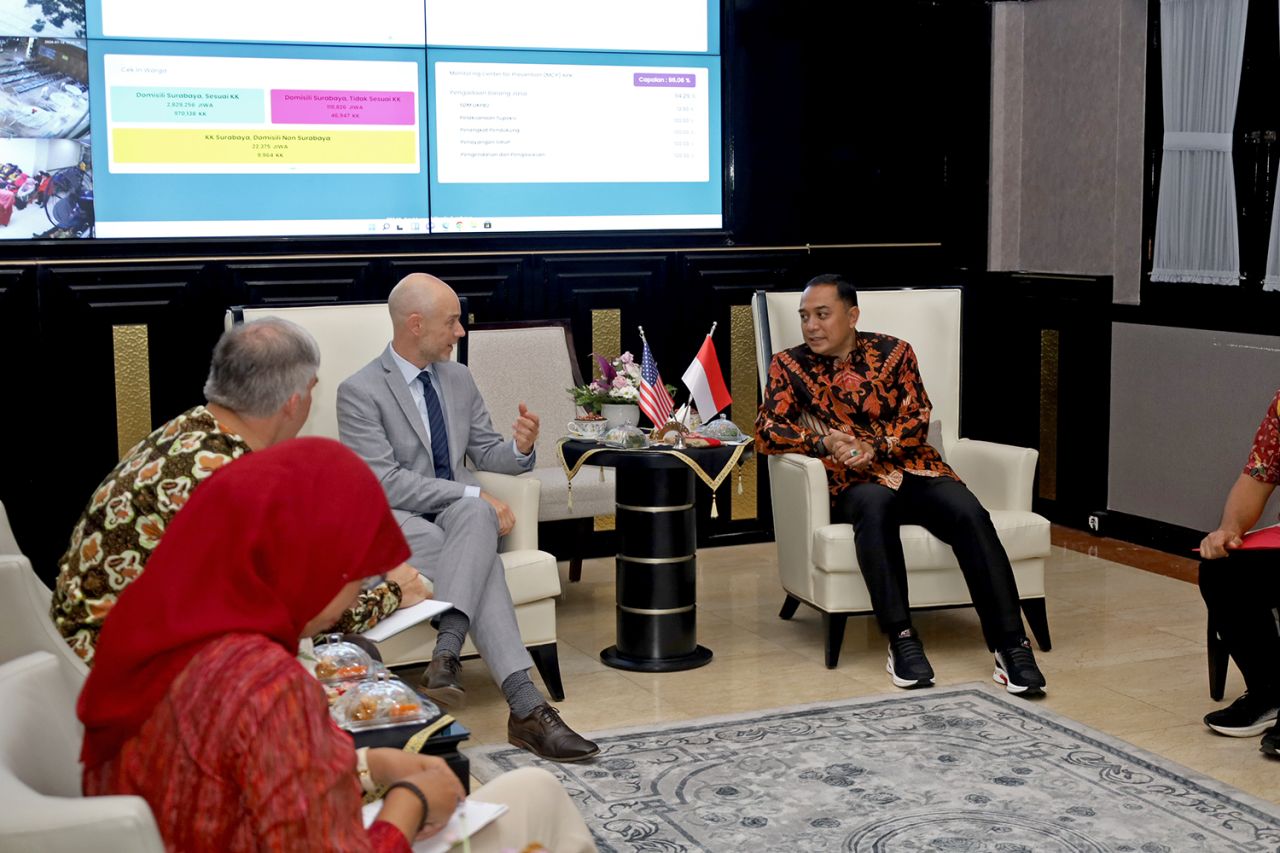 SURABAYA (Realita)- Wali Kota Surabaya Eri Cahyadi menyambut hangat kunjungan Konsulat Jenderal Amerika Serikat di Surabaya, Christopher Green di ruang kerja Walikota Surabaya, Kamis (18/7/2024).