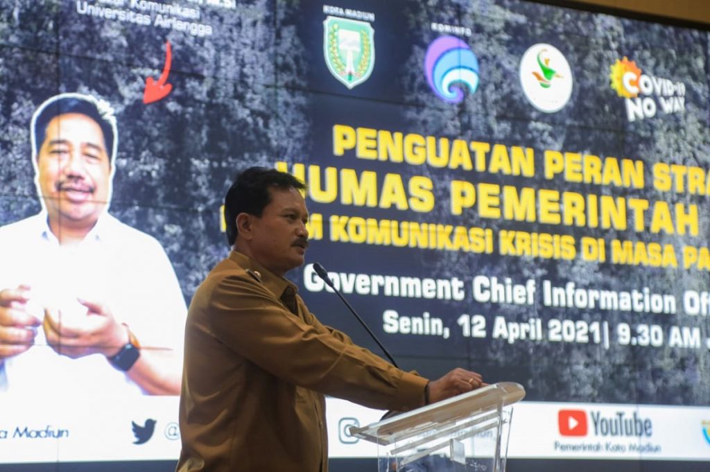 Hal itu dikatakan Walikota Madiun, Maidi saat menjadi narasumber di acara penguatan peran strategis humas dalam komunikasi krisis dimasa pandemi covid-19 yang diselenggarakan Dinas Kominfo di gedung GCIO Kota Madiun, Senin (12/4/2021). Menurutnya, dengan perkembangan teknologi saat ini, humas dimasing-masing organisasi perangkat daerah (OPD) dapat memanfaatkan medsos untuk menyebarluaskan informasi terkait perkembangan dan kebijakan pemerintah. Tentunya informasi yang up to date, apa adanya, instruktif, empati, dan respek. Supaya masyarakat lebih paham dalam menghadapi pandemi covid-19.
