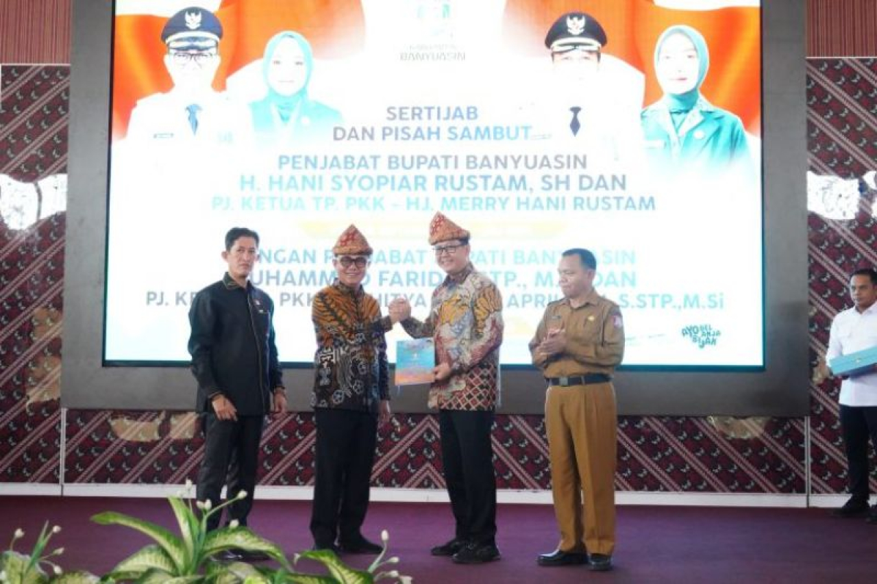 BANYUASIN (Realita)- Pemerintah Kabupaten Banyuasin menggelar Serah Terima Jabatan (Sertijab) dan Lepas Sambut Penjabat (Pj) Bupati Banyuasin H. Hani S Rustam, SH Pj Ketua TP- PKK Banyuasin Periode September 2023-Juli 2024 dengan Pj Bupati Banyuasin Muhammad Farid, S.STP M.SI dan Pj Ketua TP PKK Adhitya Trinia Apriliani, S.STP M.Si di Graha Sedulang Setudung Selasa (23/7/2024).