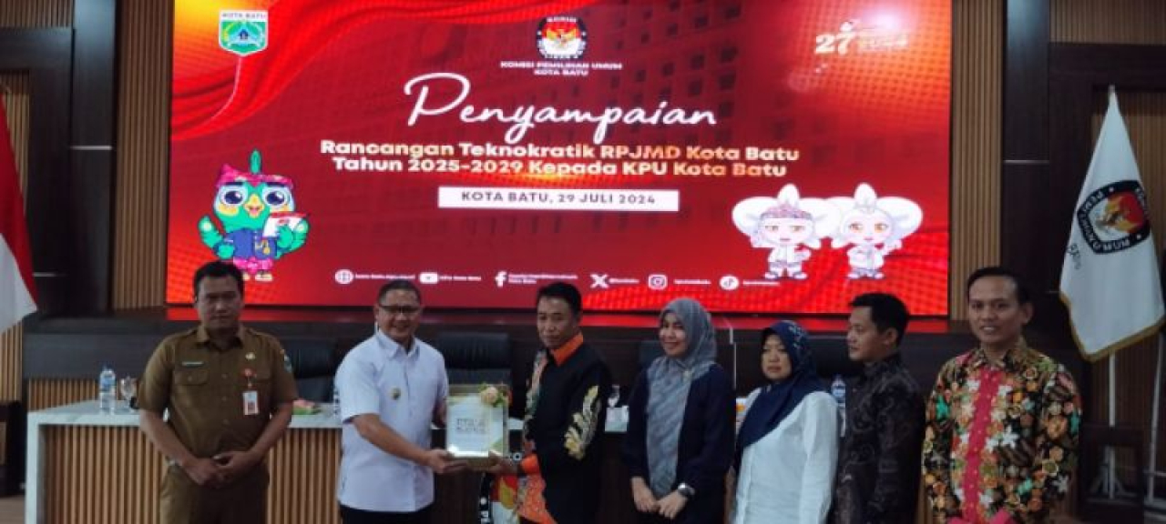 BATU (Realita)-Pj Wali Kota Batu Aries Agung Paewai menyerahkan Rancangan Teknokratik RPJMD Kota Batu Tahun 2025-2029 kepada Ketua KPU Kota Batu, Heru Joko Purwanto di Aula KPU Jalan Sultan Agung Kota Batu, Senin (29/7/2024)