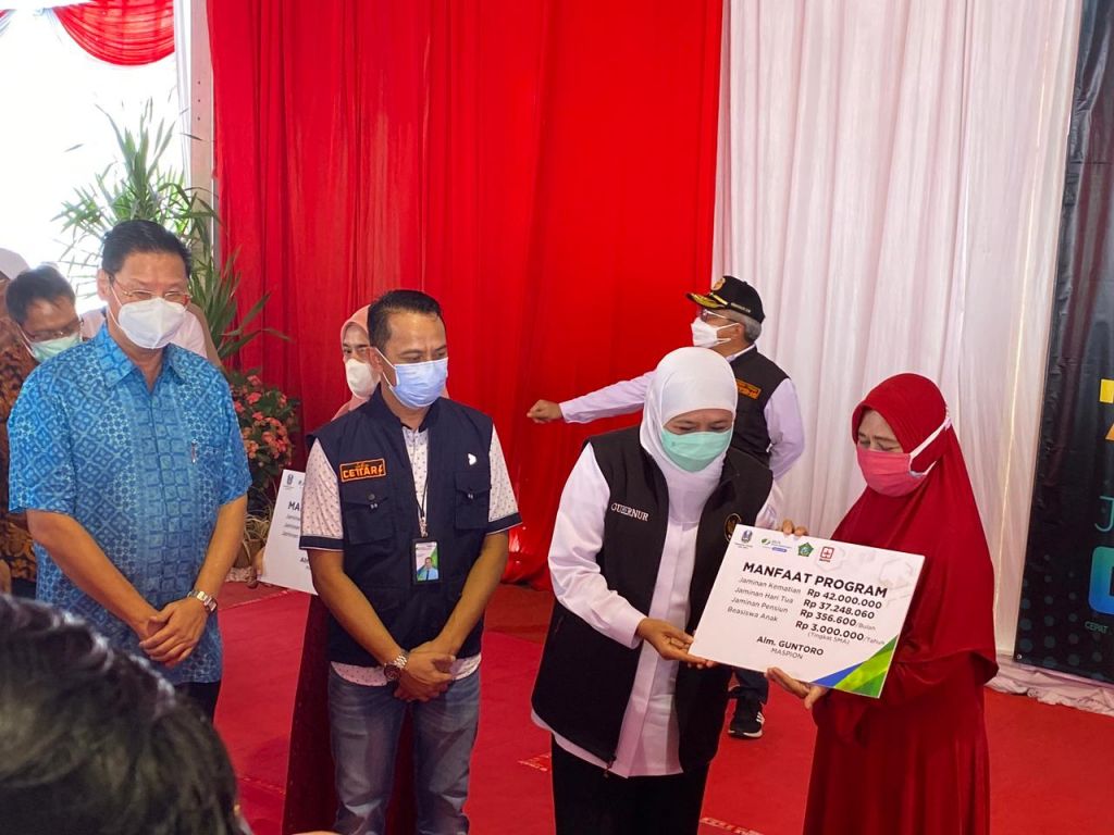 Penyerahan manfaat program BPJAMSOSTEK tersebut diserahkan Gubernur Jawa Timur, Khofifah Indar Parawansa, didampingi Deputi Direktur Wilayah BPJAMSOSTEK Jawa Timur, Deny Yusyulian, dan Direksi PT Maspion Group, Welly Muliawan, dalam kegiatan vaksinasi Pemerintah Provinsi Jawa Timur untuk pekerja di Maspion II Buduran, Sidoarjo.