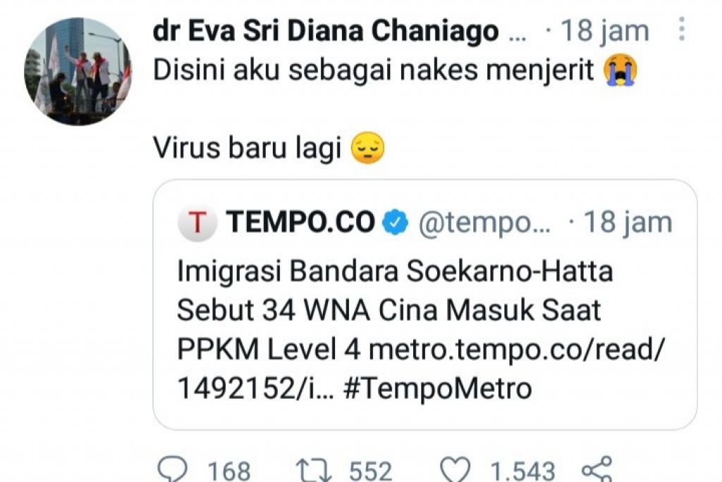 Menanggapi informasi tersebut, Ketua Dokter Indonesia Bersatu, Dokter Eva Sri Diana Chaniago menyampaiakan keresahannya melalui unggahan di akun Twitter @__Sridiana_3va.