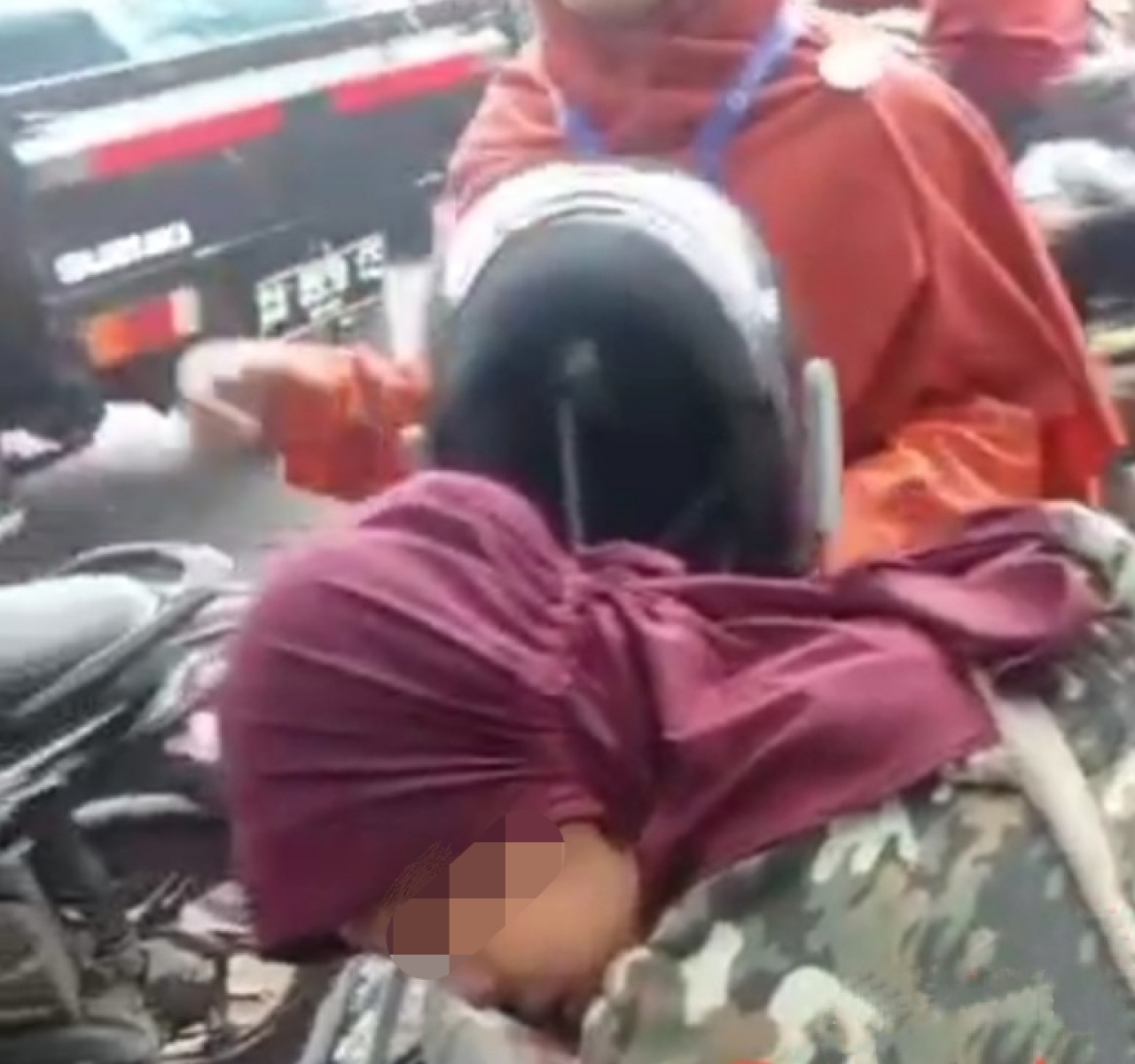Emak-emak itu pingsan di atas motor, kepalanya terkulai di atas setang.
