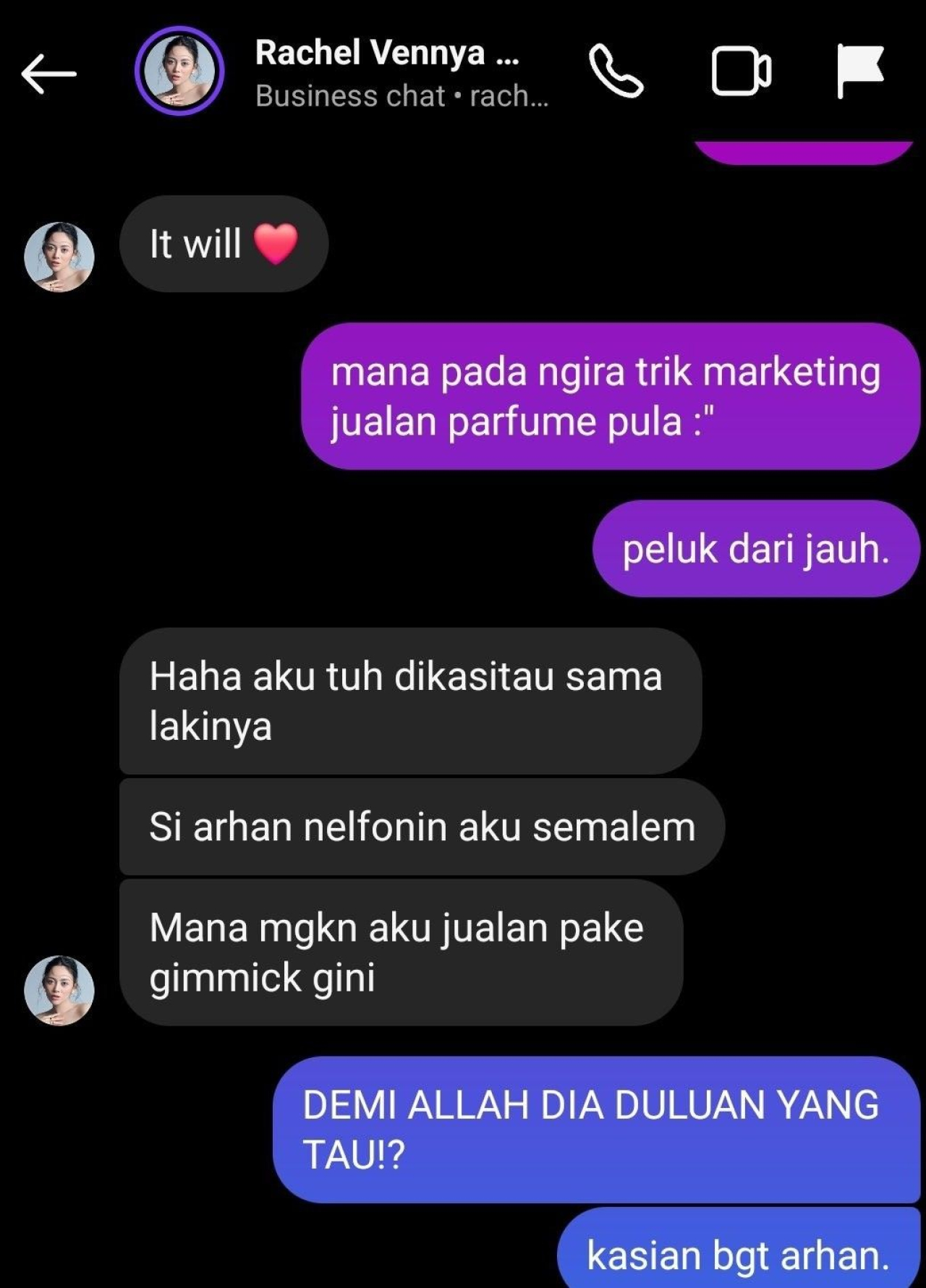 "Haha aku tuh dikasitau sama lakinya. Si arhan nelfonin aku semalem. Mana mgkn aku jualan pake gimmick gini," kata Rachel Vennya dalam tangkapan layar yang beredar di X.
