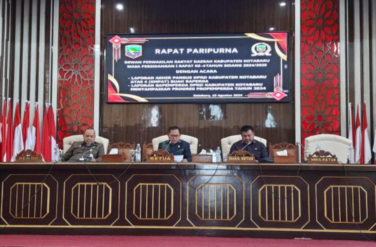 KOTABARU (Realita)- Dipimpin oleh Ketua DRPD Kotabaru Syairi Mukhlis. S. Soa Rapat Paripurna dengan agenda laporan panitia khusus (Pansus) DPRD Kotabaru atas empat Raperda, Senin (19/8/2024).