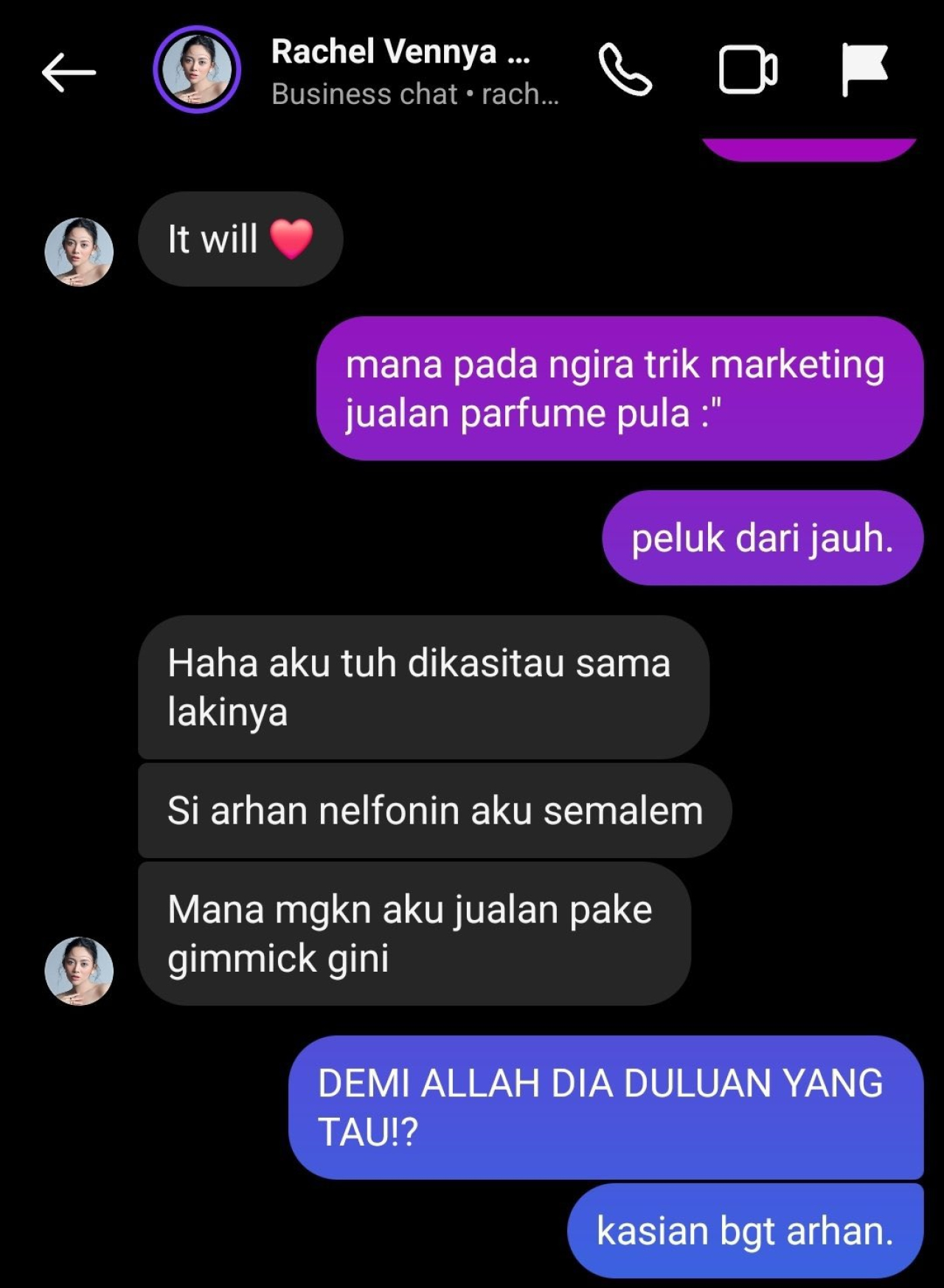 Dalam obrolan direct message (DM) yang beredar, Rachen Vennya membantah tudingan bahwa isu perselingkuhan ini sebagai trik marketing untuk kepentingan bisnisnya. Ia bahkan mengaku bahwa Pratama Arhan-lah yang pertama kali menghubunginya tentang ini.