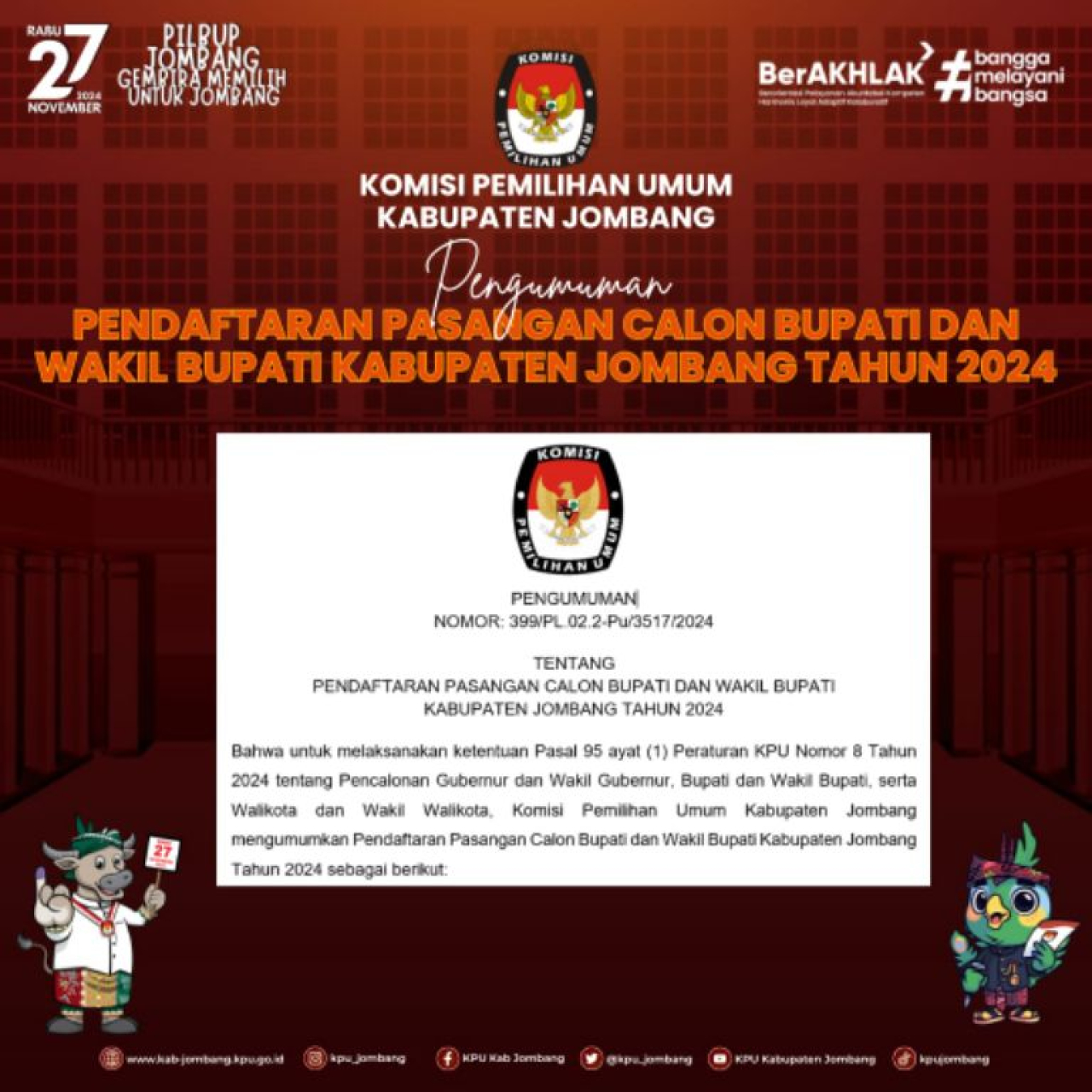 Pengumuman pendaftaran pasangan calon Bupati dan calon Wakil Bupati Jombang 2024 tersebut, tertuang dalam surat nomor 399/PL.02.2-PU/3517/2024.