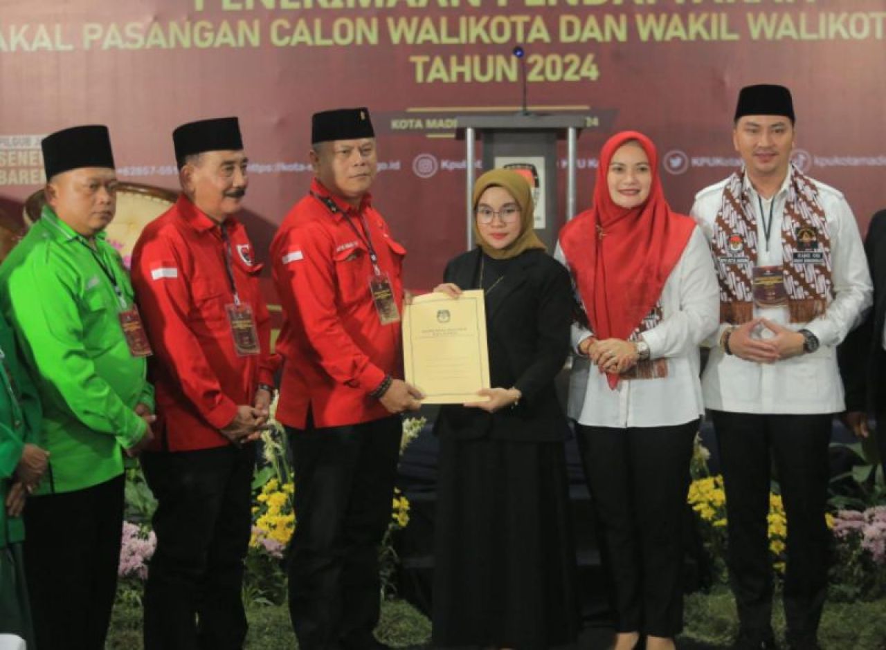 Sebelum berangkat mendaftarkan diri ke KPU setempat, pasangan ini bersama PDIP dan PPP mendeklarasikan pencalonan bakal paslon di kantor DPC PDIP Kota Madiun, Kamis (29/8/2024) malam.