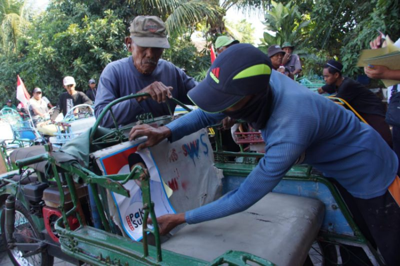 Saat ditanya apakah becak miliknya juga dipasang stiker bergambar salah satu bacabup, ia pun membenarkan hal tersebut. "Iya di pasang stiker di becak, sama di spet tulisan WS warna biru," tuturnya.