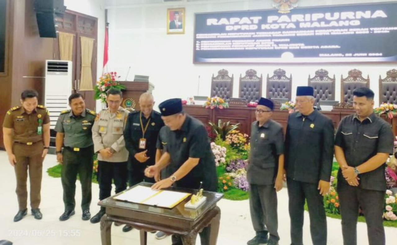 KOTA MALANG (Realita) - Dewan Perwakilan Rakyat Daerah (DPRD) Kota Malang menyetujui Rancangan Peraturan Daerah (Ranperda) tentang Rencana Pembangunan Jangka Panjang Daerah (RPJPD) Kota Malang 2024-2045 menjadi Peraturan Daerah (Perda) Kota Malang. Hal itu ditandai dengan penandatangan persetujuan bersama antara eksekutif dan legislatif dalam rapat paripurna, yang digelar di Gedung DPRD Kota Malang, Selasa (25/6/2024).