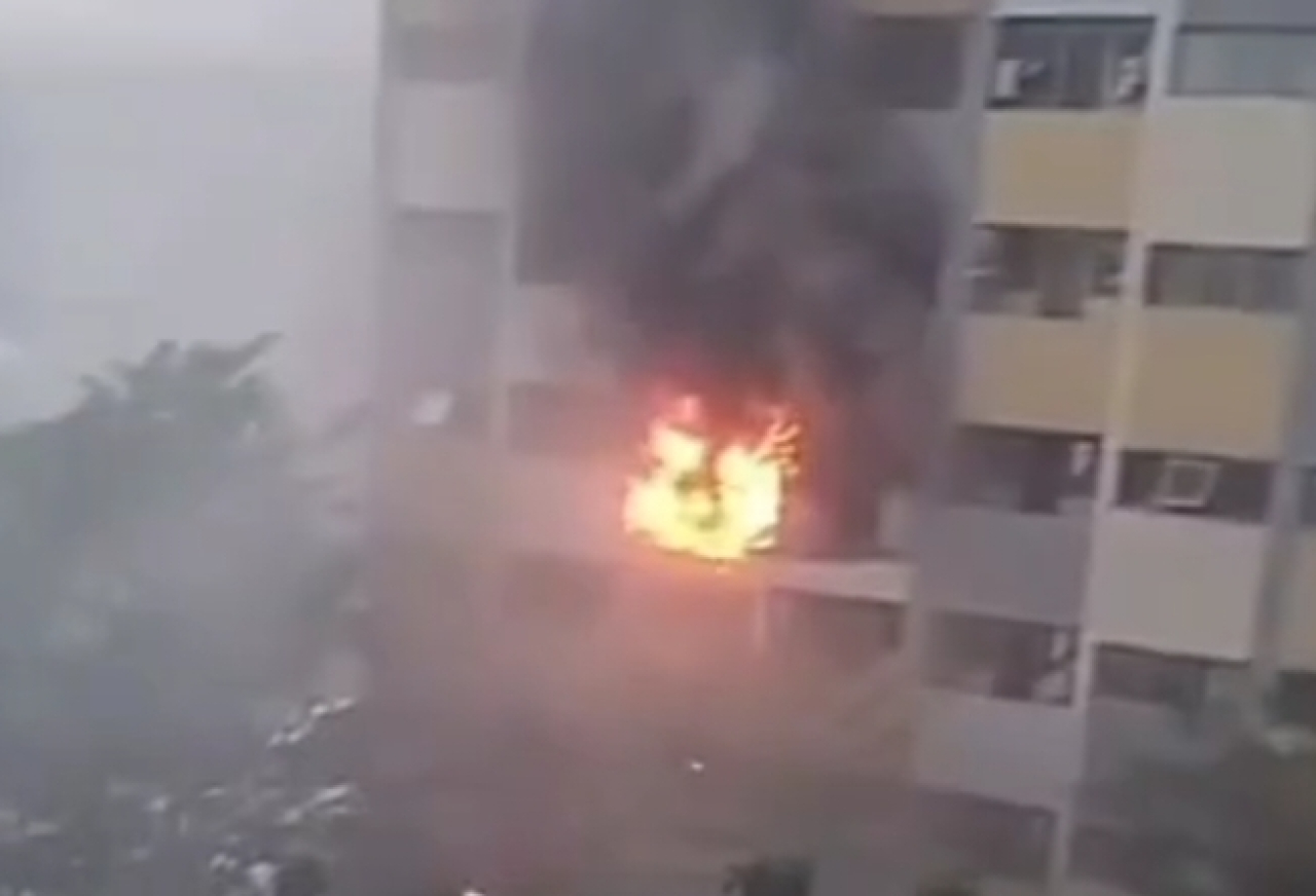 Kobaran api dan asap tebal terlihat membumbung tinggi ke udara. Bahkan, sempat terdengar suara ledakan sehingga menyebabkan sebagian tembok bangunan dan kaca di unit tersebut hancur.