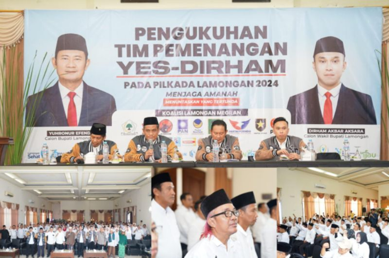LAMONGAN (Realita) - Tim pemenangan pasangan bakal calon Bupati dan Wakil Bupati Lamongan, Yuhronur Efendi (YES) - Dirham Akbar Aksara, menargetkan kemenangan hingga 70% pada Pemilihan Kepala Daerah (Pilkada) tahun ini. Target ini disampaikan setelah tim pemenangan resmi dikukuhkan di Aula Hotel Mahkota Lamongan, Sabtu (7/9/2024).