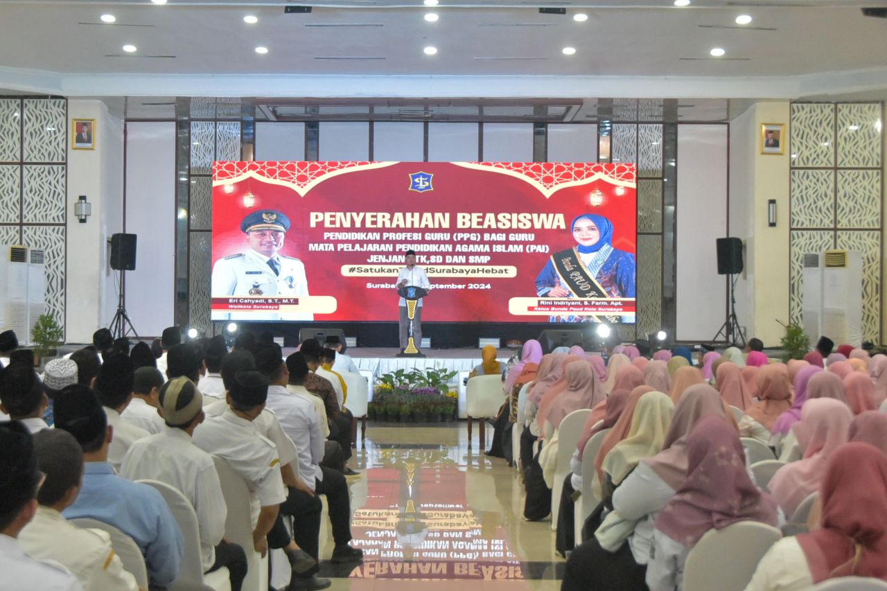 SURABAYA (Realita)- Pemerintah Kota (Pemkot) Surabaya bekerjasama dengan Kementerian Agama (Kemenag) Kota Surabaya memberikan beasiswa Pendidikan Profesi Guru (PPG) kepada guru mata pelajaran Pendidikan Agama Islam (PAI). Beasiswa PPG ini diberikan secara langsung oleh Wali Kota Surabaya Eri Cahyadi kepada 713 guru SMP, SD, dan TK se-Surabaya di Convention Hall, Rabu, (11/9/2024).