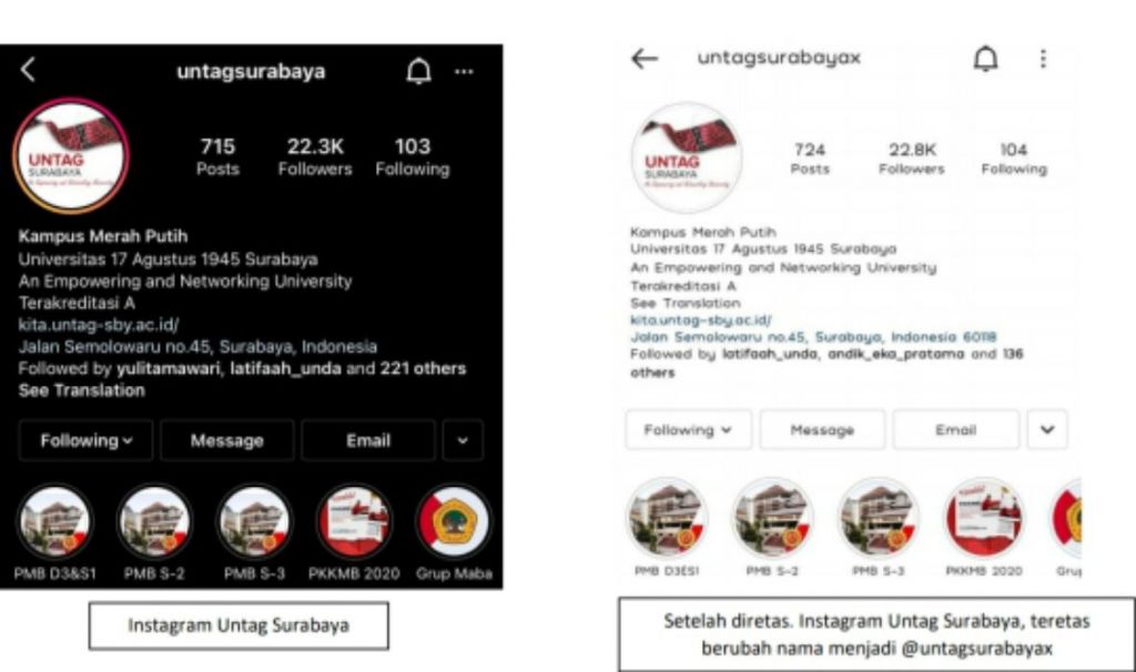 “Untag Surabaya selaku pemilik akun resmi tersebut menghimbau untuk tidak mempercayai akun Instagram yang teretas sampai waktu yang akan diberitahukan secara resmi dari pengelola Media sosial Untag Surabaya. Hingga saat ini kami masih melakukan upaya mengembalikan akun tersebut,” kata Kabag Humas Universitas 17 Agustus 1945 (Untag) Surabaya, Karolin Rista.