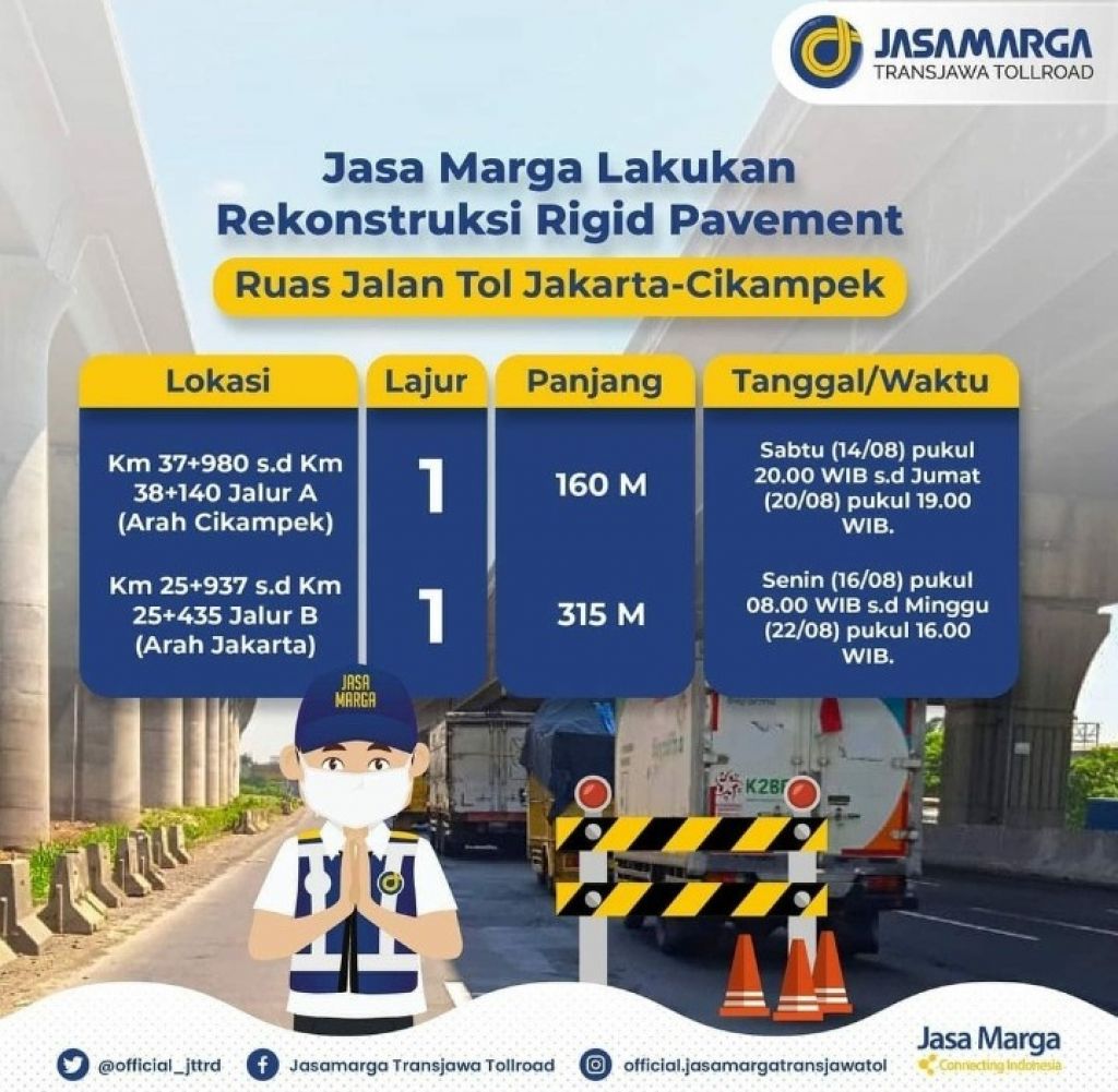 1. Km 37+980 s.d Km 38+140 lajur 1 Ruas Jalan Tol Jakarta-Cikampek arah Cikampek dengan total panjang penanganan 160 meter yang akan dilaksanakan mulai Sabtu (14/08) pukul 20.00 WIB s.d Jumat (20/08) pukul 19.00 WIB.