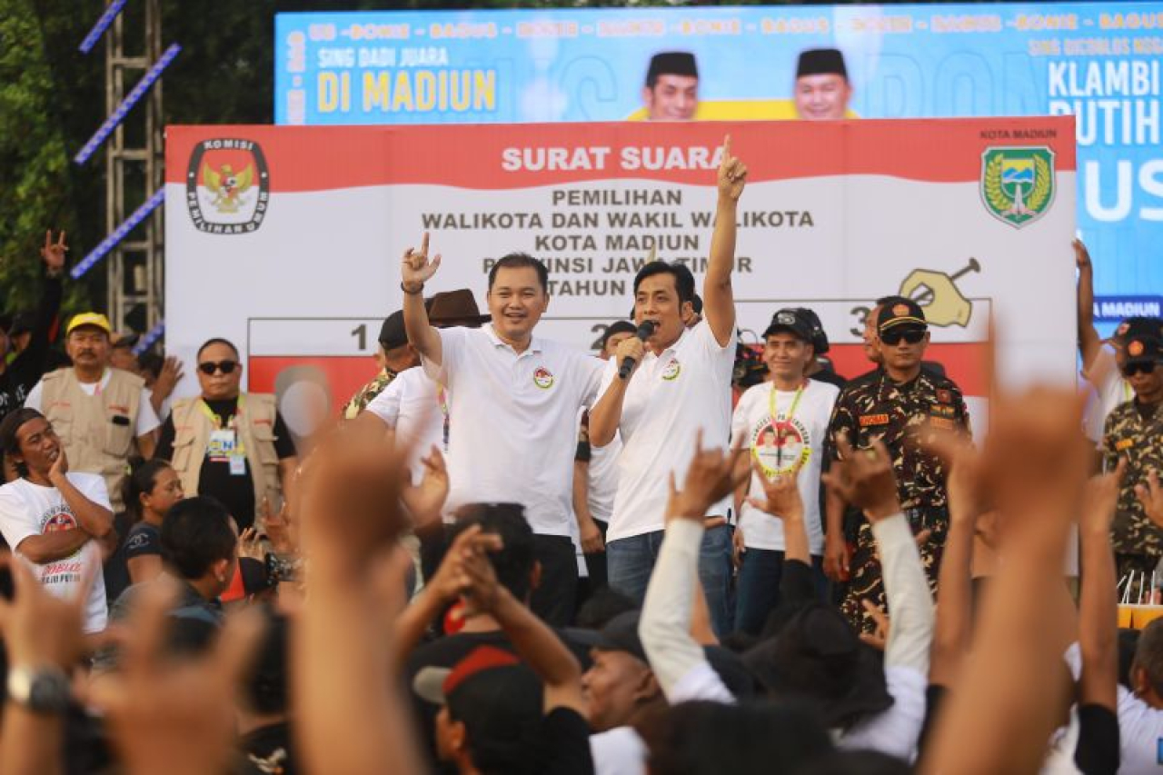 MADIUN (Realita) – Kampanye akbar Pilwalkot 2024 Kota Madiun mulai digelar. Kampanye yang mengundang banyak massa itu perdana dibuka pasangan calon (paslon) Bonie Laksmana-Bagus Rizki Dinarwan (Bonus) di Lapangan Rejomulyo, Kota Madiun, Minggu (6/10/2024).