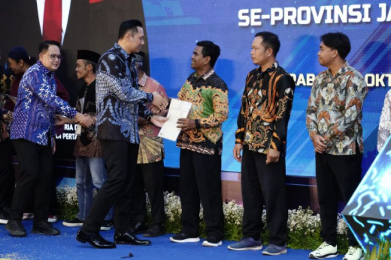SURABAYA (Realita) - Warga asal Kabupaten Lumajang, Joko Santoso (57) baru saja menerima sertipikat tanahnya dari Menteri Agraria dan Tata Ruang/Kepala Badan Pertanahan Nasional (ATR/BPN), Agus Harimurti Yudhoyono (AHY) pada Selasa (08/10/2024).
