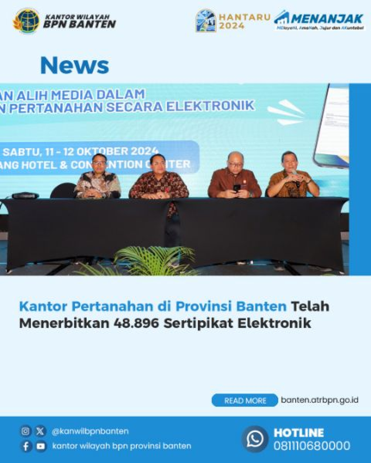 Pada kegiatan tersebut, Kepala Bidang Penetapan Hak dan Pendaftaran Kantor Wilayah BPN Provinsi Banten, Yayat Ahadiat Awaludin mengatakan sejak 30 Mei 2024 seluruh kantor pertanahan di Provinsi Banten telah mengimplementasikan Sertipikat Elektronik (Sertipikat el).