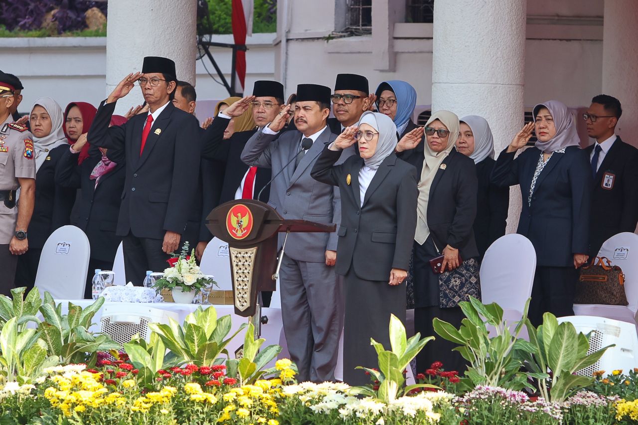 SURABAYA (Realita)- Pemerintah Kota (Pemkot) Surabaya menggelar upacara peringatan Hari Ulang Tahun (HUT) ke-79 Pemerintah Provinsi Jawa Timur, di Halaman Balai Kota Surabaya, Senin (14/10/2024). Dalam kesempatan tersebut, Penjabat Sementara (PJs) Wali Kota Surabaya Restu Novi Widiani, membacakan sambutan Penjabat (Pj) Gubernur Jawa Timur Adhy Karyono tentang kesiapan Jatim menjadi gerbang menuju Ibu Kota Nusantara (IKN) Baru.