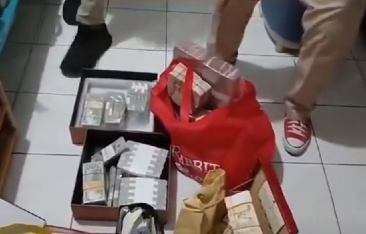 Catatan itu tampak ditulis tangan dengan bolpoin. Gepokan uang dolar AS itu kemudian diletakkan di lantai bersama gepokan uang pecahan Rp 100 ribu di sebuah tas jinjing merah yang juga ditemukan jaksa.