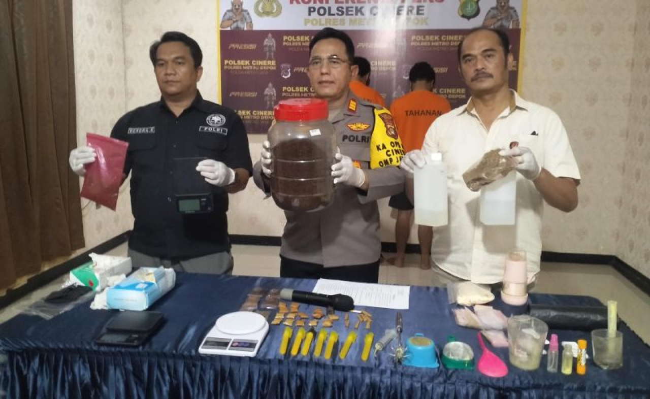 Di lokasi itu, lanjut Pesta Hasiholan, jajaran Polsek Cinere pun menemukan barang bukti berupa tembakau sintetis yang siap edar beserta alat-alat yang dipergunakan membuat atau memproduksi narkotika itu.