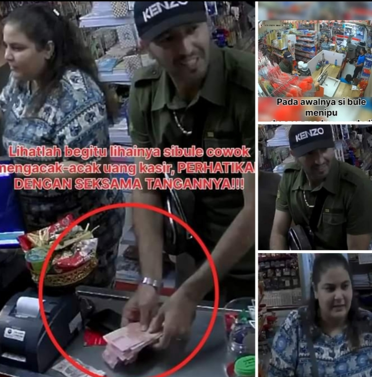 Pasangan bule tersebut berpura-pura berbelanja, dengan pria yang mencoba membeli sebuah flashdisk. Namun, saat ingin membayar, pria tersebut hanya membawa uang pecahan asing yang tidak dapat diterima oleh toko.