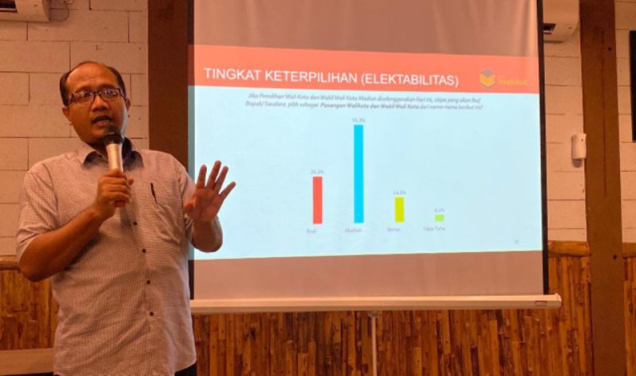 Menggunakan metode multistage random sampling terhadap 400 responden dengan margin of eror 4,9 persen, kata Sugeng, paslon Madiun memiliki dukungan tertinggi dengan 46,5 persen dalam survei pertanyaan tertutup. Disusul pasangan Inda Raya- Aldi Dwi Prastianto (Dadi) sebesar 28 persen dan Bonie Laksmana- Bagus Rizky Dinarwan (Bonus) sebesar 12 persen. Sedangkan untuk survei pertanyaan tertutup, paslon Madiun masih diunggulkan dengan tingkat elektabilitas sebesar 55,3 persen. Kemudian paslon Dadi sebesar 26,3 persen dan paslon Bonus sebesar 15,3 persen.