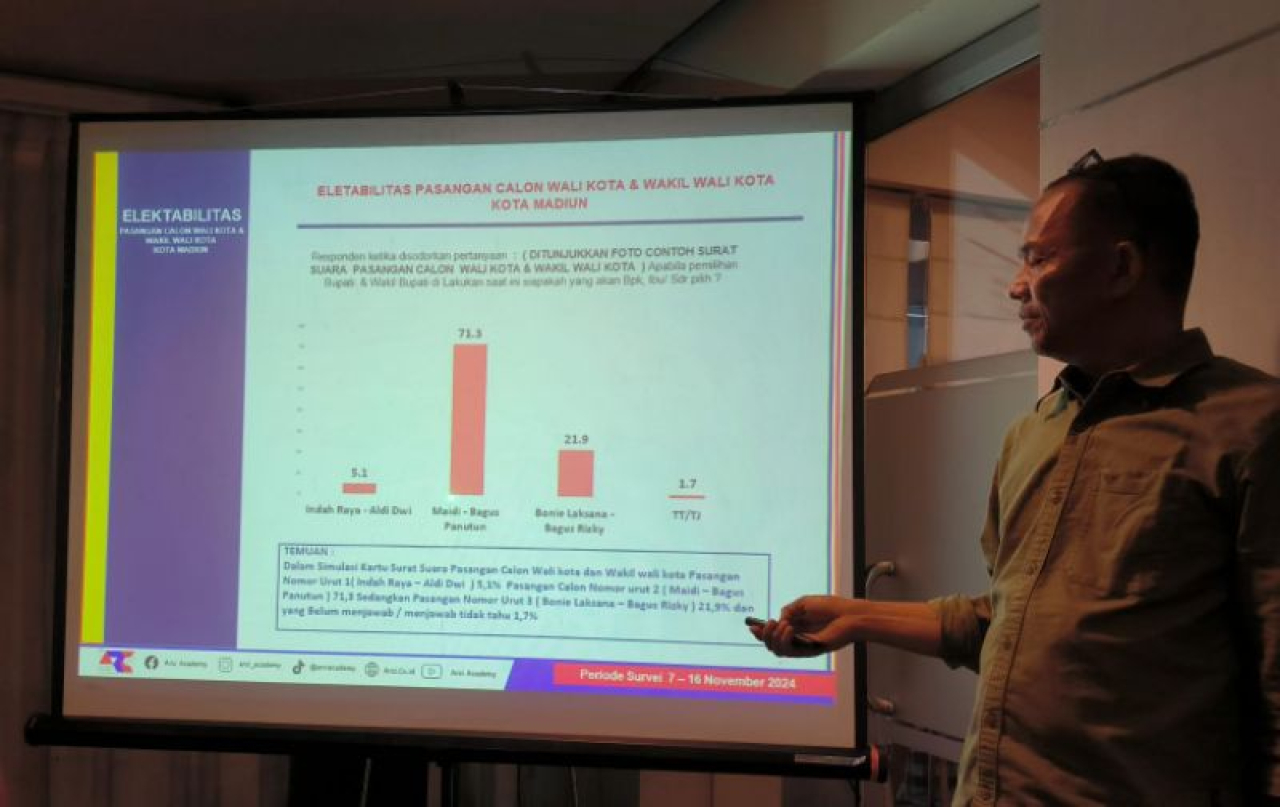 Sedangkan untuk survei pertanyaan tertutup, sambung dia, paslon Madiun memperoleh 71,3 persen. Kemudian, paslon Bonus sebesar 21,9 persen dan paslon Dadi sekitar 5,1 persen.