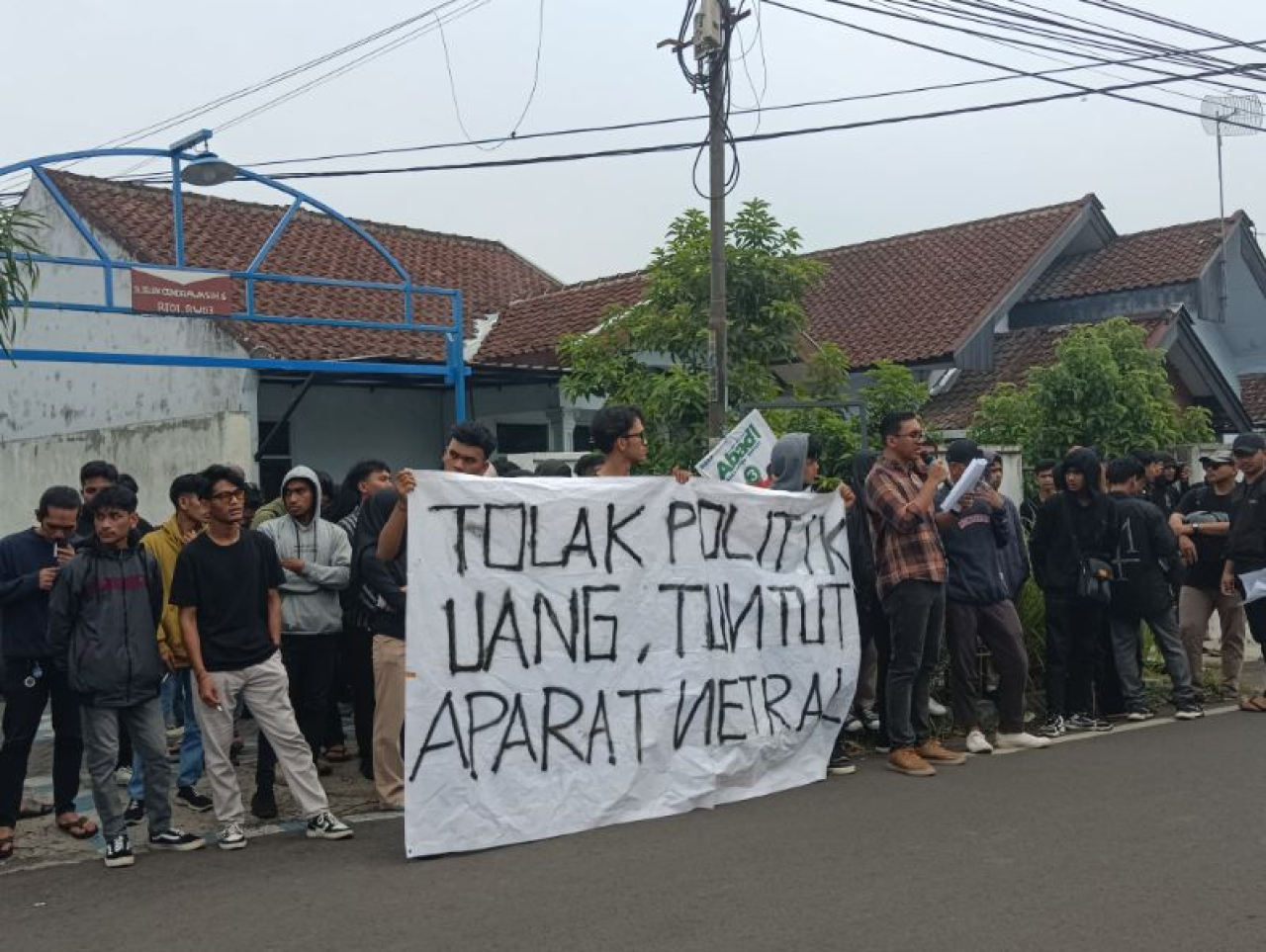 Mereka tiba di Kantor Bawaslu pada Pukul 14.30 WIB. Poster bertuliskan 'Tolak Politik Uang, Tuntut Aparat Netral' turut dibentangkan dalam aksi itu.
