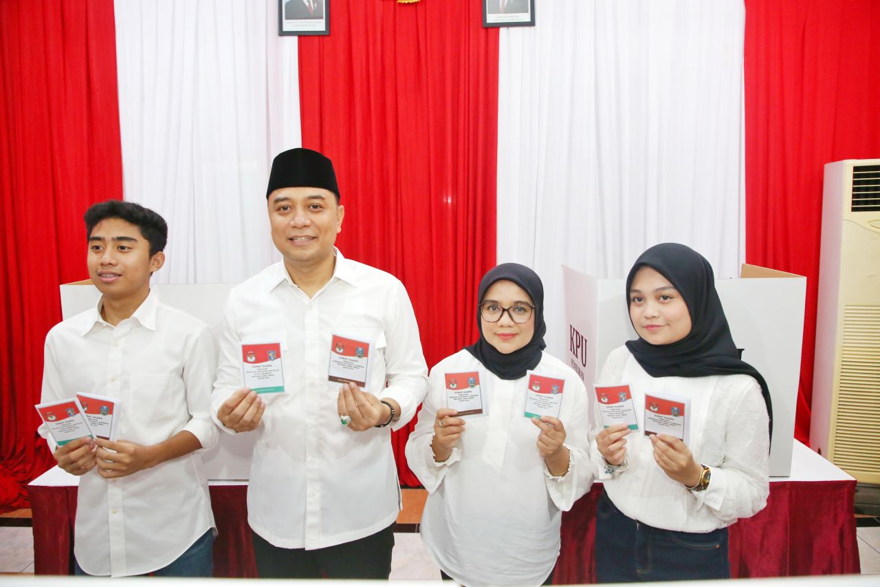 Dalam Pemilihan Presiden (Pilpres) lalu, Wali Kota Eri datang ke TPS hanya bersama istrinya, Rini Indriyani, dan anak pertamanya Alfanana Puteri. Nah, di Pilkada 2024 semakin lengkap, ia datang ke TPS sekaligus dengan anak keduanya, Rahmad Haidar Pasha sebagai pemilih pemula.