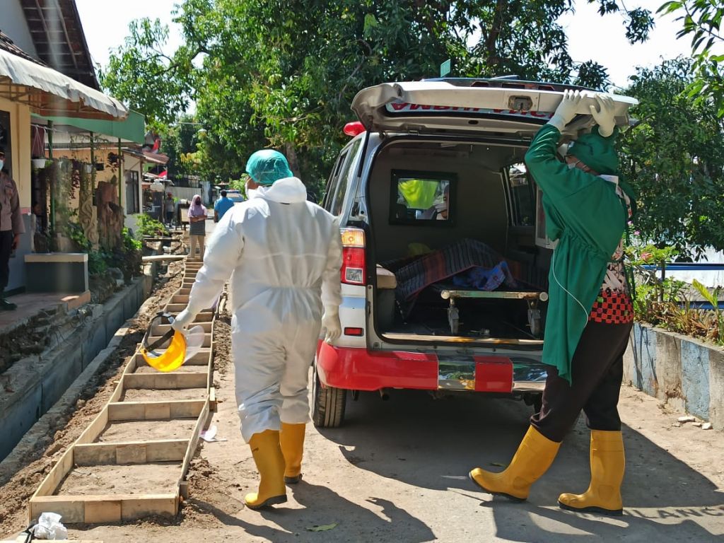 Evakuasi jenasah S pun dilakukan secara Protokol Kesehatan (Prokes). Sejumlah petugas puskesmas be APD lengkap membawa jasad S dan dimasukkan ke mobil Ambulan untuk selanjutnya dimakamkan secara protokol covid.lin