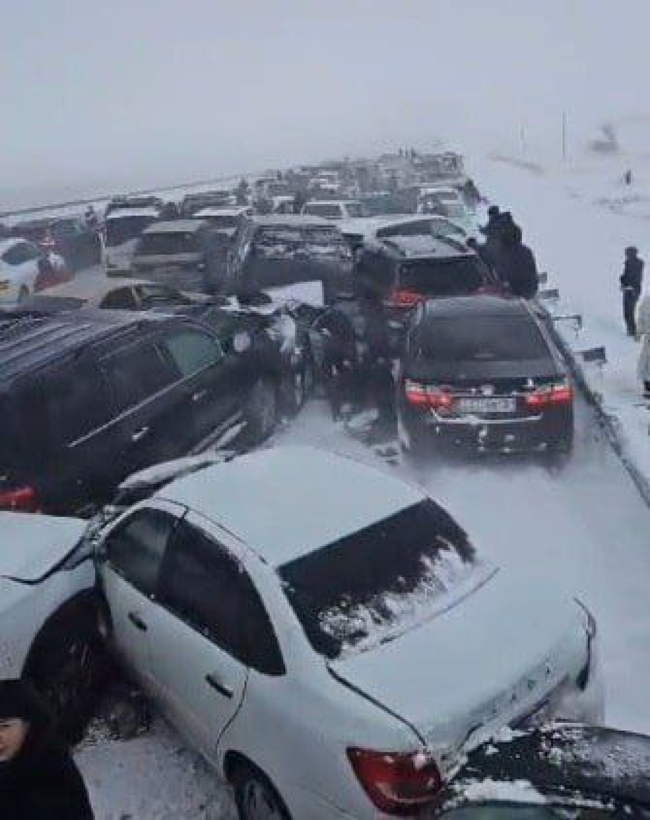 Kecelakaan itu terjadi dalam kondisi cuaca buruk, dengan badai salju lebat dan lapisan es yang membuat perjalanan menjadi berbahaya di beberapa jalan.