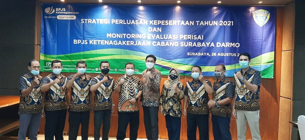SURABAYA (Realita) - Badan Penyelenggara Jaminan Sosial Ketenagakerjaan atau BPJAMSOSTEK Surabaya Darmo menggelar pertemuan bersama Penggerak Jaminan Sosial Indonesia (Perisai) BPJS Ketenagakerjaan Surabaya Darmo, Jumat (27/8/2021). Kegiatan ini bertujuan untuk penguatan strategi perluasan kepesertaan Tahun 2021 dan monitoring serta evaluasi kinerja para Agen Perisai BPJS Ketenagakerjaan Surabaya Darmo.