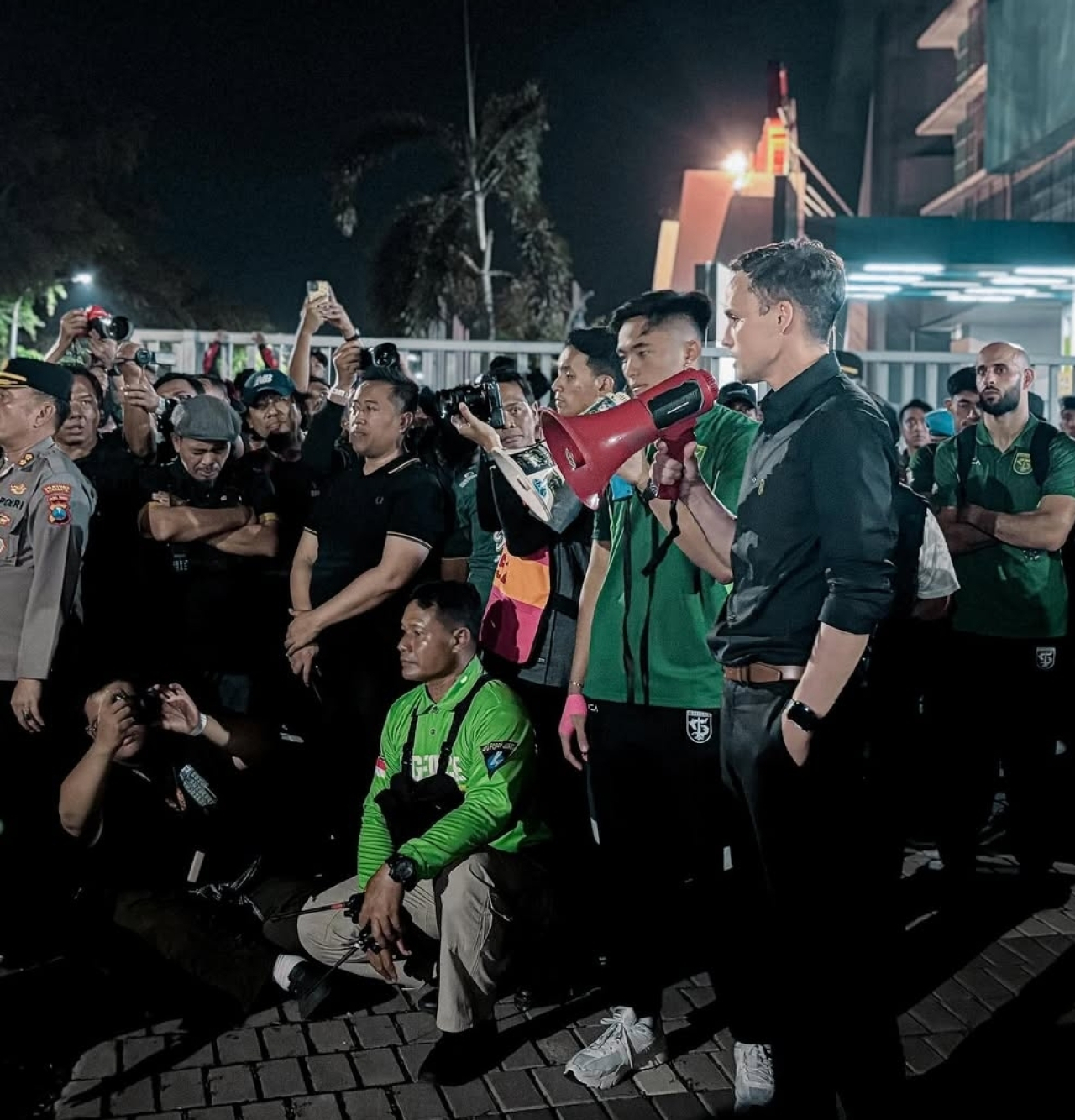 SURABAYA (Realita)- Setelah laga Persebaya vs Persita Tangerang berakhir, pelatih Persebaya Paul Munster bersama skuadnya ditemui oleh para Bonek, suporter fanatik Persebaya.